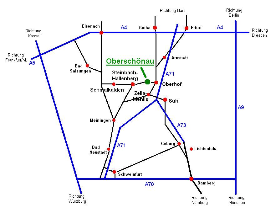 Mögliche Anfahrten: - von der A4, AA-Gotha, B247, Oberhof, nach Oberschönau - von der A71, AA-Oberhof, Oberhof, nach Oberschönau - von der A71, AA-Suhl/ Zella-Mehlis,Steinbach- Hallenberg, nach Oberschönau - über Meiningen, Schwarza, Steinbach-Hallenberg, nach Oberschönau - über Schmalkalden, Steinbach- Hallenberg, nach Oberschönau - über Schleusingen, Suhl, Zella-Mehlis, Steinbach- Hallenberg oder Oberhof,nach Oberschönau | ||||||||||||||||||||||||||||||||||||||||||||||||||||||||||||||||||||||||||||||||||||||||||||||||||||